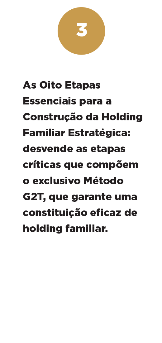Nesse processo, desenvolvi um método exclusivo e eficiente para a estruturação segura de uma holding familiar e dos demais instrumentos de planejamento, o MÉTODO G2T, que apresento no Sucessão Estratégica, um programa avançado de qualificação em planejamento patrimonial e planejamento sucessório, idealizado para desvendar as complexidades e nuances essenciais no gerenciamento e transmissão eficaz de patrimônios.